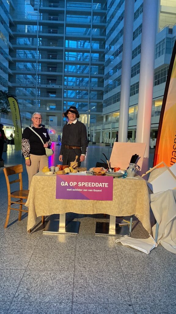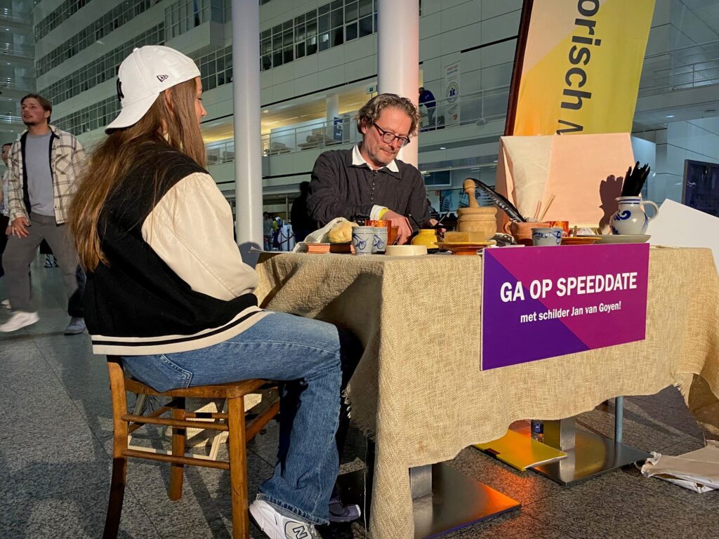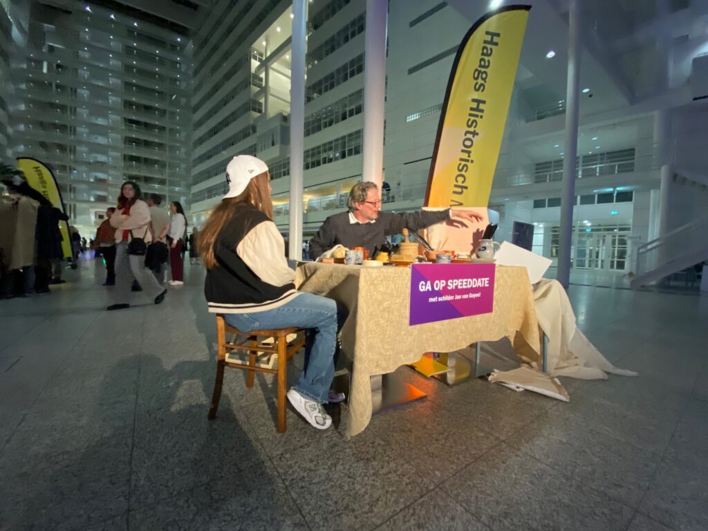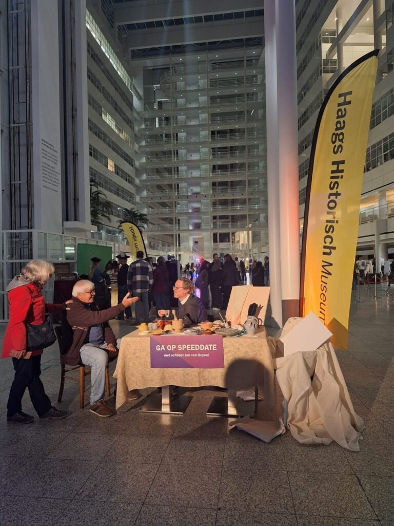 Are you looking for an unexpected encounter? Come to the Atrium tonight and speed date with the famous 17th-century painter Jan van Goyen or his hardworking maid, Hermien Saftleven. Jan created the iconic painting ‘Gezicht op Den Haag’ – a masterpiece from the Hague Historical Museum, now on display in the Atrium. During this evening, he’ll join you to talk about his art, his life, and the most exciting stories of his time. Prefer a different perspective? Then choose his maid, Hermien, who will take you into her world of kitchen secrets, hard work, and daily life in The Hague back then. Don’t miss this unique opportunity to meet Jan or Hermien!